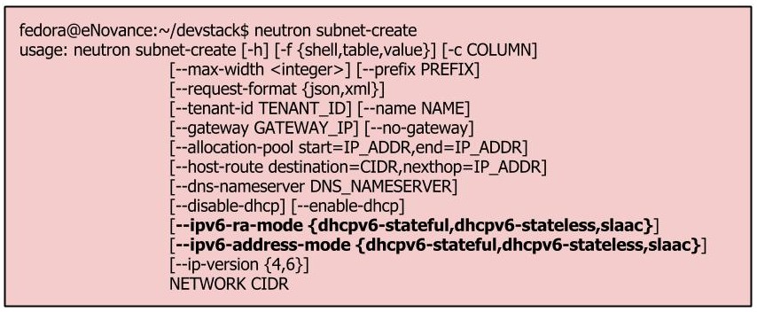 In order to create IPv6 subnets two new attributes, ipv6-ra-mode and ipv6-address-mode, were added to the Neutron Subnet API. Using these two attributes, you will be able to create subnets which support various IPv6 configuration modes like Stateless Address Autoconfiguration (SLAAC), DHCPv6 Stateful and DHCPv6 Stateless. Not all combinations of these parameters are valid. You can refer to the following link (and also here) which explain the valid/invalid use-cases.