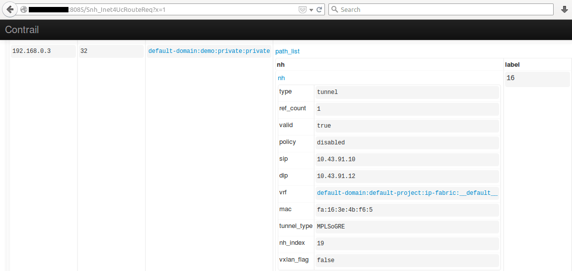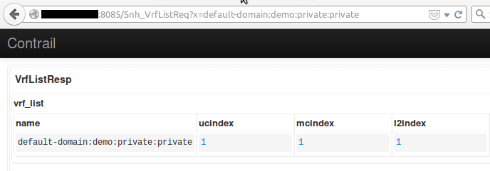 - VrfListReq, http://<vrouter agent ip>:8085/Snh_VrfListReqWhich gives you the networks and the VRFs related. For a given VRF – let’s say the Unicast VRF (ucindex) – we can see all the routes.
