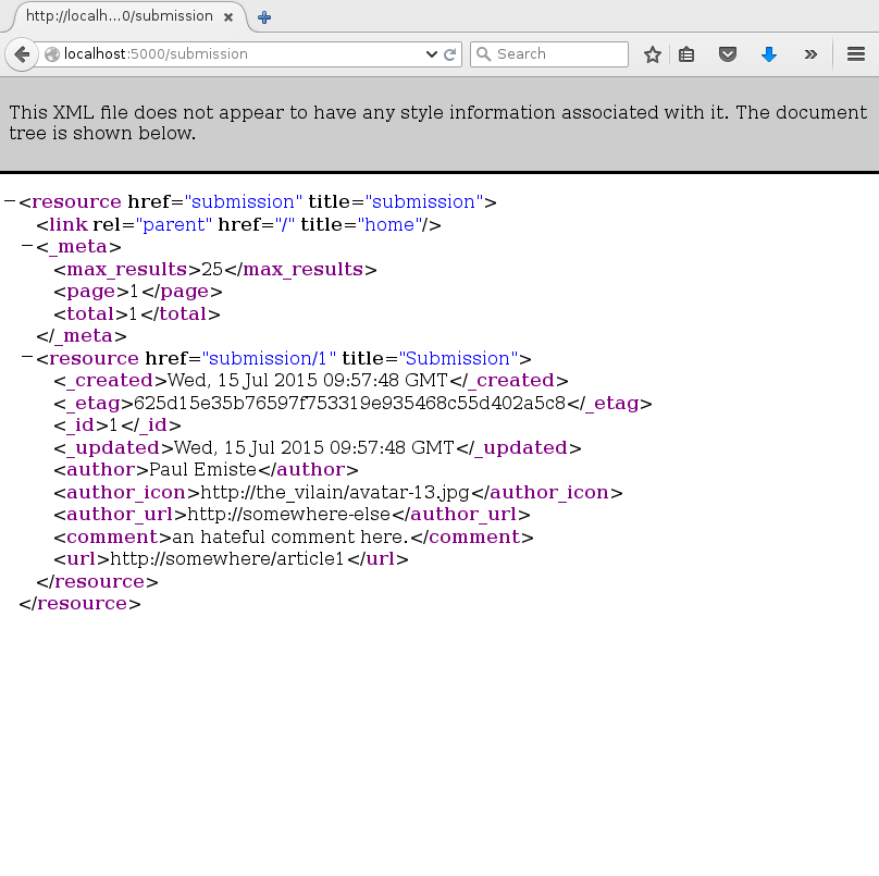 We can view this first post in the submission item list at http://127.0.0.1:5000/submission or directly at http://127.0.0.1:5000/submission/1. Here again, Python-Eve do all the work for us.