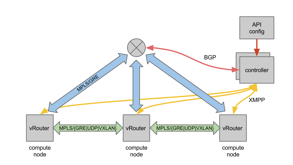 The controller acts as a Route Reflector, announcing routes according to what has been done on the Config/API side and the peering nodes. As we saw in the dataplane post, the controller is using BGP or XMPP in order to exchange routes. XMPP is used between the controllers and the vRouters, BGP is used between the controllers and the gateway routers. One more thing about XMPP, even if it is used for route announcements this is not its only goal. It is used for some other purposes like Service-Chaining, Virtual-Machine related informations, etc.