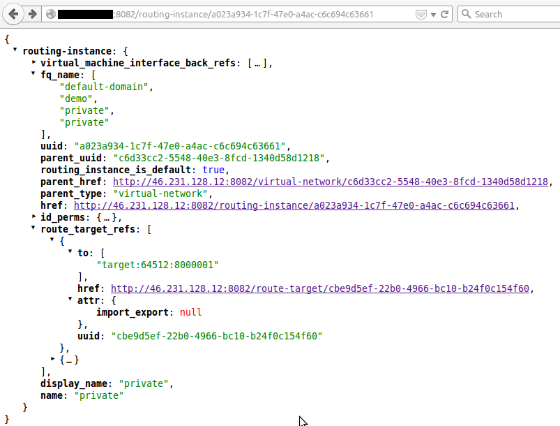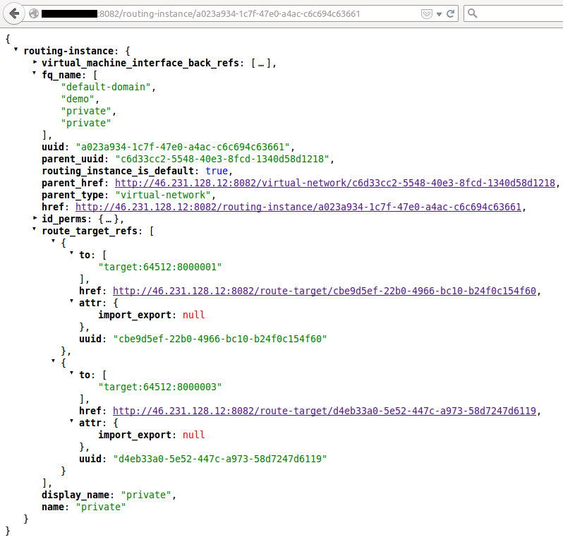 At the API side we can check the result of the resources created by the Schema-Transformer, thus what is the Routing-Instance for a specific network, for instance for our private network.